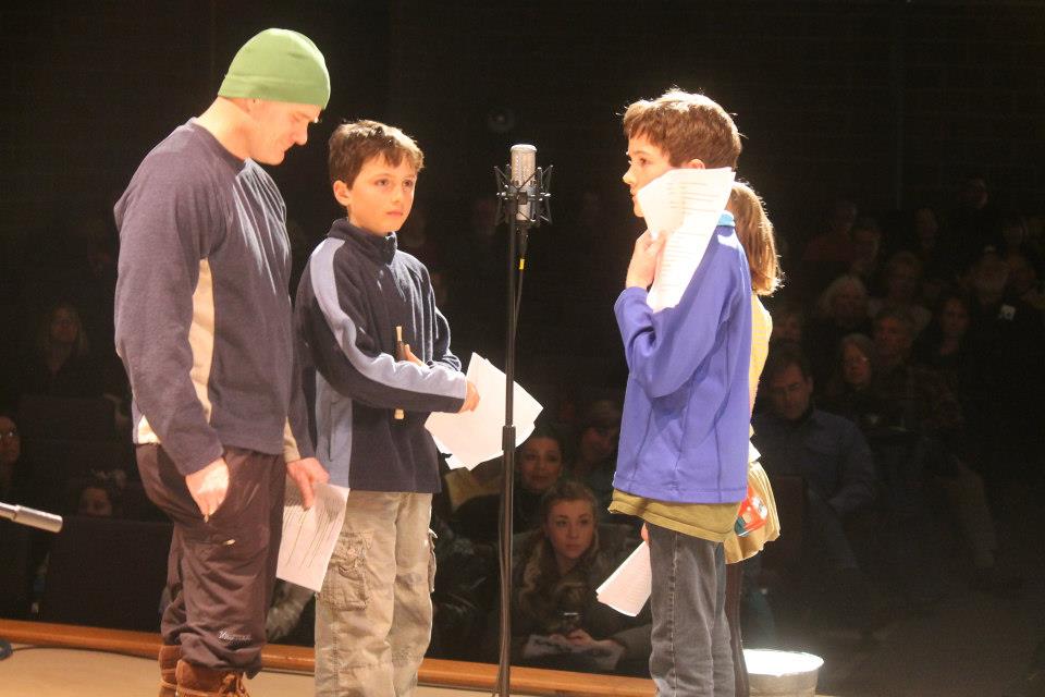 | The Saxton family, including dad Robert with Louis, Tommy and Charlotte get ready to perform a sketch about the challenges of taking kids out to tap maple syrup. They were filling in after a guest cancelled and wrote, rehearsed and prepared this funny bit just 90 minutes before the show. Robert was actually on snowshoes in the woods when I called him just before noon. |