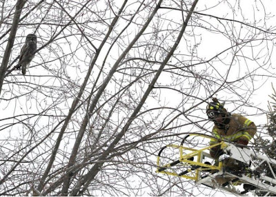 In the pages of the Hibbing Daily Tribune, this story is recalled as an exercise in ill-suited rescue equipment. The owl, at last skeptical of the situation, now including a slowly approaching mechanized ladder and full dress firefighter, flew off, with crows in pursuit. A local bird expert, upon seeing the owl, determined that the owl was fine.